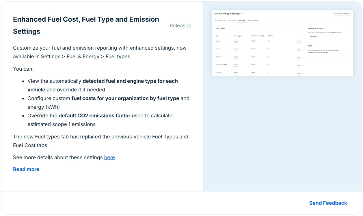 What it Does: This feature gives fleets more control and accuracy in tracking fuel costs and emissions. Samsara’s dashboard now lets you customize fuel and energy settings by fuel type. The system automatically detects each vehicle’s fuel or engine type (diesel, gasoline, electric, etc.) and you can override it if needed. You can also input custom fuel costs for each fuel type (e.g. per-gallon price for diesel vs. gasoline, or cost per kWh for EVs) instead of relying on a single national average. Additionally, you can override the default CO₂ emission factors used for calculating your fleet’s estimated Scope 1 greenhouse gas emissions.