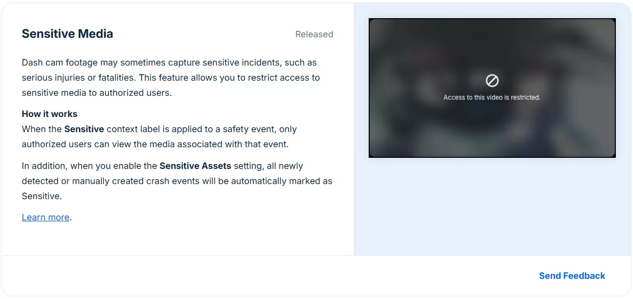 What it Does: Not all new Samsara features are strictly about ROI. Sensitive Media is a safety feature that restricts access to especially sensitive or graphic dash cam footage. Samsara now allows you to tag certain safety events as “Sensitive,” which means only authorized users can view the associated videos or images. For example, footage of a severe collision, injury, or other incident with sensitive content can be labeled so that it’s not freely viewable by every user on your dashboard. This creates an access control layer for sensitive dash cam media.