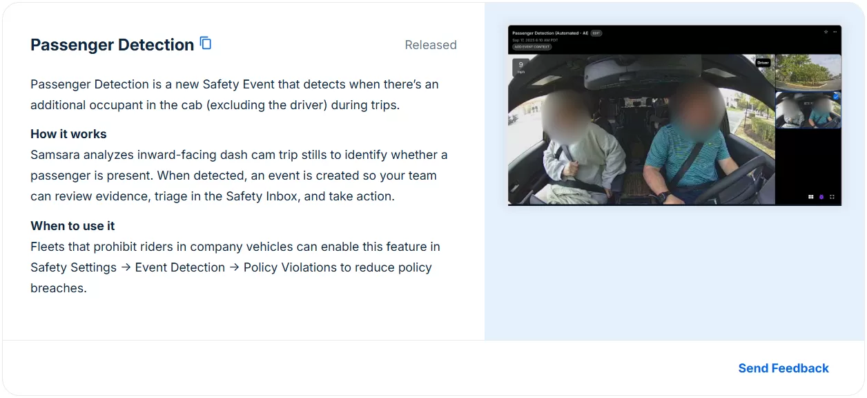 What it Does: Passenger Detection is a new AI safety event that alerts you when there’s an unexpected passenger in the vehicle cab. In other words, Samsara’s dual-facing dash cam can now detect if someone else (besides the driver) is present during a trip, and create a “Passenger Detected” event. This is particularly useful for fleets that prohibit unauthorized riders (for safety, security, or insurance reasons). If a driver picks up a hitchhiker, brings a friend along, or otherwise has an extra person on board against company policy, the system will flag it.